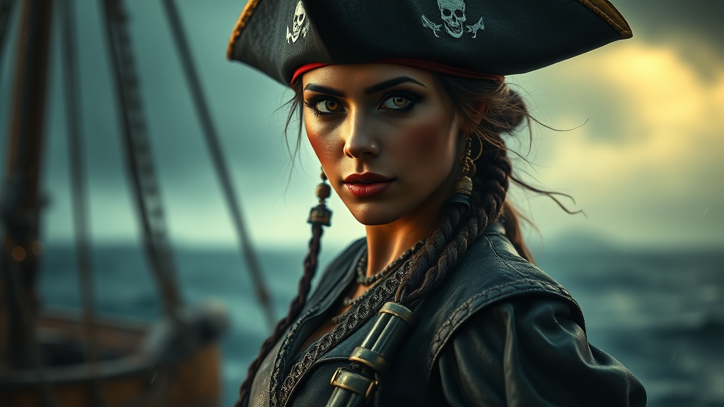 A waist-length body shot of a captivating lady pirate in a stormy weather backdrop with thick, moody atmosphere. Her skin glows with a light brown hue, hinting at Middle Eastern heritage, while her piercing gaze tells a story of a femme fatale. Her finely detailed pirate attire and intricate accessories capture the essence of high-seas adventure, rendered with remarkable detail. The scene is alive with photorealistic, cinematic quality, utilizing dramatic photography lighting, depth of field, and real shadows that convey a sense of movie-level production and VFX mastery. The subtle use of RTX tracing lighting enhances the overall visual storytelling, imbuing the scene with a dynamic and hauntingly beautiful energy.