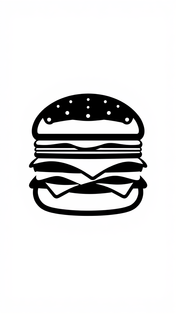 Bold minimalist logo of a classic cheeseburger, black vector illustration on a white background, featuring exaggerated layers and components with a clean, modern aesthetic.