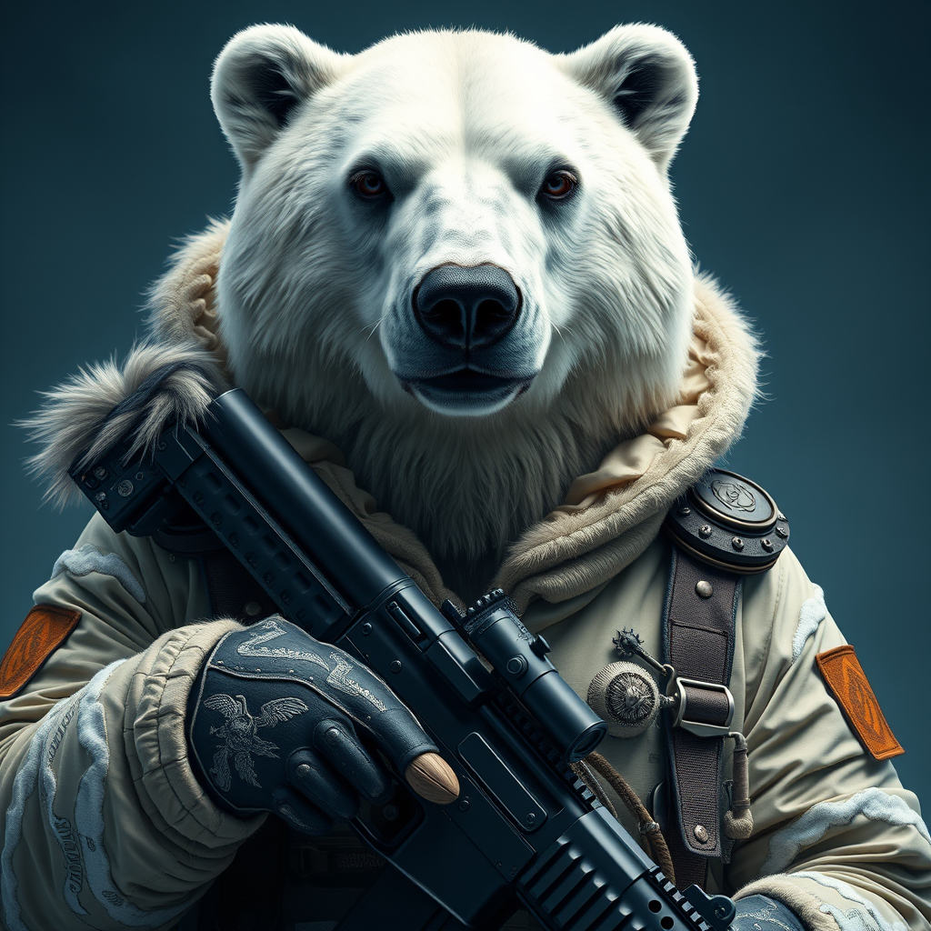 Bold polar bear clad in an elaborate arctic military outfit, gripping a sleek carbine rifle, anthropomorphic in nature, showcasing intricate details and high-resolution clarity, ultra hd, real-life rendering, exquisite facial features highlighted by cinematic lighting, set in a vertical frame ratio, with a balance of sharp quality and subtle complexity, creating a captivating visual tableau.