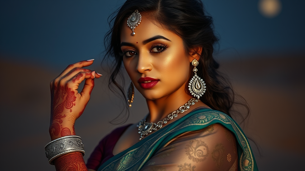 Bollywood diva with intricate henna adorned arms, full sleeve saree, and diaphanous velvet bindi with subtle golden filigree, elaborate eyes lined with kohl and lashes, delicate chutki, and slender nose ring with intricate engravings, radiant skin with a warm golden undertone, side profile tilted with an air of subtle curiosity, ornate silver anklets and bangles shimmering in moonlit light, intricate patterns woven into the saree's fabric capturing the intricate beauty of Indian craftsmanship, delicate hand-painted tilak adding a pop of vibrant color, serene and mysterious gaze, a fusion of elegance and mystique, gentle wisps of hair framing the face, the ornate teardrop earrings and layered bangles echoing the gentle rustle of a summer breeze on a desert night.