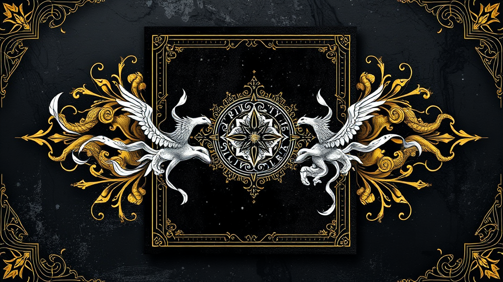 Book cover black intricate collage dark gold white ancient art digital enhancement foreshortening tattoo-inspired design elements creative variations maintained core concept solidified harmonious blend striking visuals elegant mystique rich textures layered complexity timeless depth engaging narrative visually compelling elements seamlessly integrated engaging narrative harmonious balance