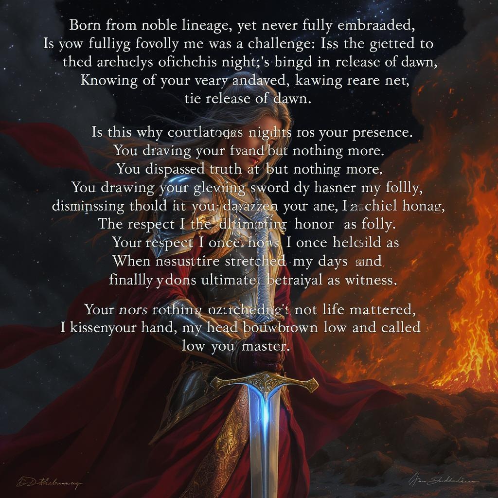 Born from noble lineage, yet never fully embraced, knowing me was a challenge. Is this why countless nights, weary of your presence, longed for the release of dawn? Drawing your gleaming sword may dazzle me, but nothing more. You dispensed truth at your whim, dismissing honor as folly. The respect I once held has faded as I anticipate the ultimate betrayal as witness. Your hours stretched into my days and finally years as my life dwindled away. When nothing else mattered, I kissed your hand, my head bowed low, and called you master.