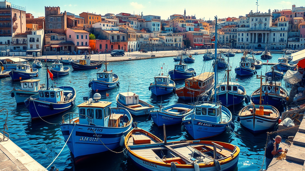 Boukaabka harbor, blue fishing vessels nestled in a vibrant cityscape, captured with a snapshot aesthetic reminiscent of Claude Monet, impressionism infused with genuine details, lively coastal scenes animated by dappled sunlight, evoking bustling maritime energy and charm, aspect ratio 160:263