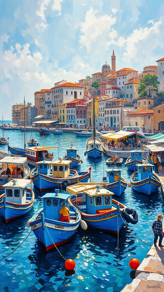 Boukaabka port with vibrant blue fishing boats scattered throughout a bustling city scene, painted in the lively style of snapshot aesthetic reminiscent of Claude Monet. The impressionistic portrayal captures authentic details of a coastal landscape, with shimmering water reflecting the energy of a vibrant harbor. The scene is filled with the hustle and bustle of daily life, infusing the air with a sense of movement and motion, as sunlight dances across colorful sails and lively streets.