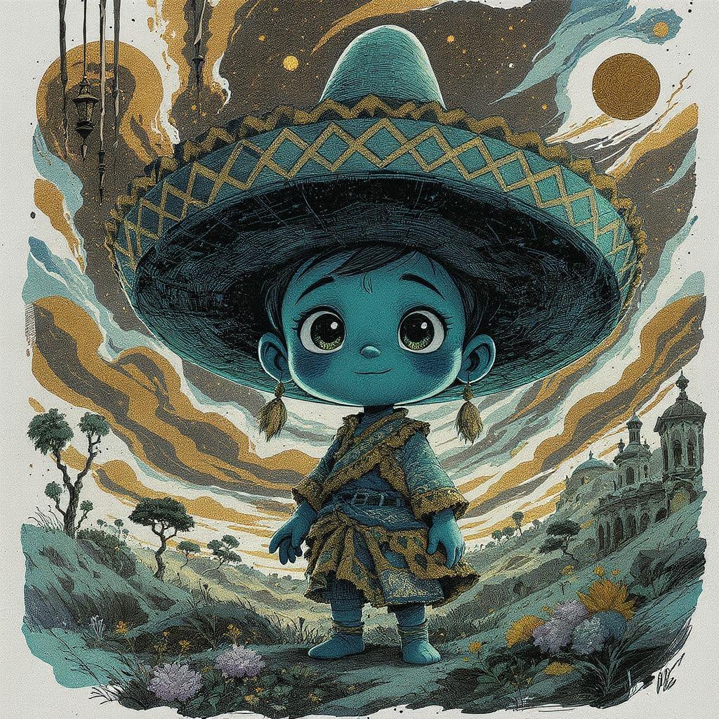 A cartoon boy with an oversized sombrero, depicted in detailed comic book art style, featuring a color palette of dark cyan and bronze. The artwork employs stains and washes, enhancing the texture and depth, and incorporates RTX-like rendering for added vibrancy. The boy's expression captures child-like innocence, his detailed costume rich with patterns and intricate designs. The theme explores cultural narratives, offering a playful yet respectful nod to various influences, while maintaining a whimsical and imaginative tone. The background hints at a fantastical landscape, complementing the character's youthful curiosity.
