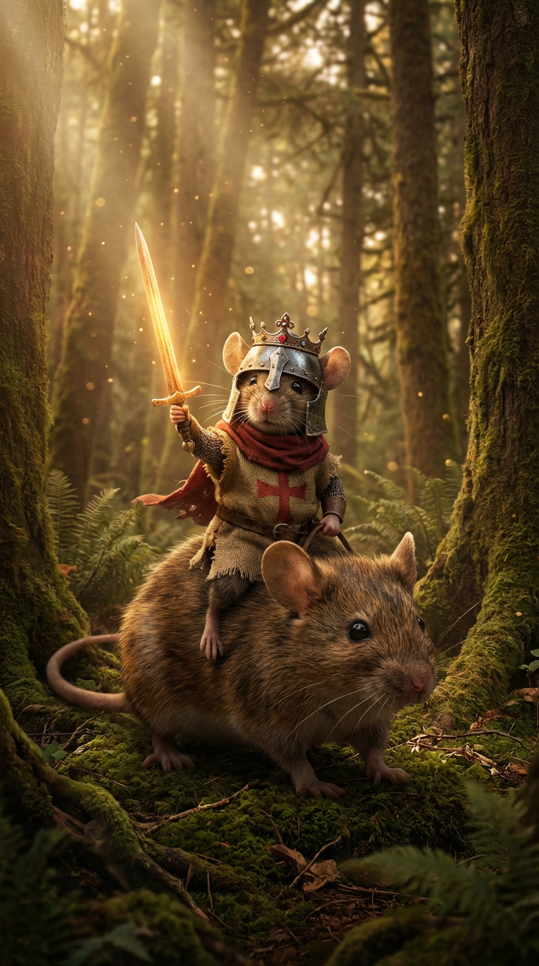 A courageous mouse knight, adorned in a medieval helmet and crown, wields a glowing golden sword while riding a larger mouse through an enchanting forest. Golden hour lighting filters through the trees, creating a magical and mystical atmosphere.