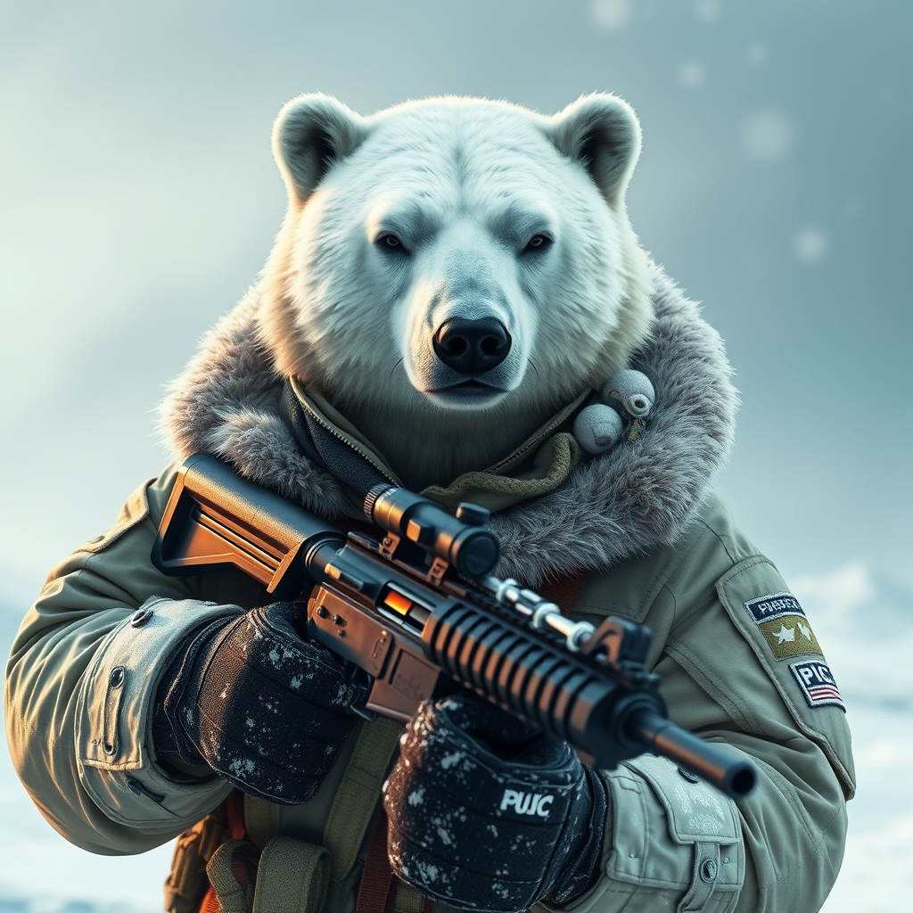 Brave polar bear donning a sophisticated winter military uniform, gripping a carbine rifle, with anthropomorphic qualities, hyper-detailed, ultra high definition, 8k resolution, lifelike presence, intricate facial features, dramatic cinematic lighting, set in a 9:16 aspect ratio, showcasing a fearless expression, surrounded by a snowy landscape, emphasizing strength and determination.