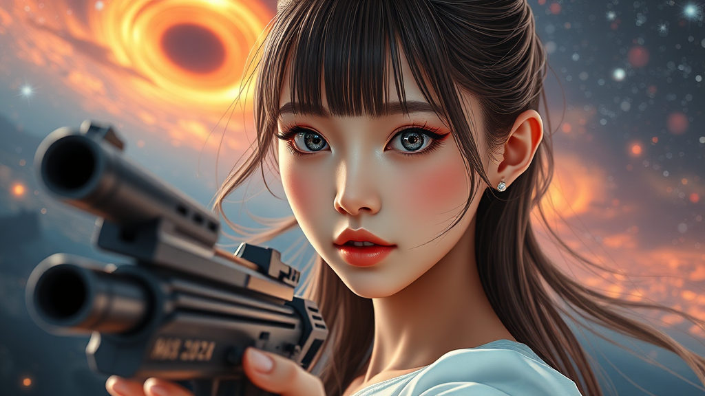 BREAK, 1girl, solo, engaging with viewer, straight bangs, 3d facial detail, captivating girl, gorgeous face, pretty, kpop celebrity, supermodel allure, striking symmetry, perfect physique, medium bust, slender waist, slim legs, luminous eyes, goddess-like, natural skin, radiant complexion, pale skin tone, beautifully intricate face, detailed facial features, authentic skin, delicate face, finely crafted facial lines, golden proportions, harmonious facial structure, expressive gaze, immaculate face, pristine skin, flawless appearance, lustrous hair, fair skin, well-proportioned body, perfect anatomy, realistic skin texture, full lips, glossy lips, subtle makeup, vibrant pupils, graceful silhouette, complex eyes, defined pupils, detailed face and eyes, long eyelashes, slight blush, elegant hands, ideal hands, charming face, beautiful feminine form, meticulously detailed skin, dewy complexion, BREAK, science fiction, flowing long hair, holding firearm, adventurous expression, star-filled sky, vibrant colors, wormhole universe, futuristic skyline, cyberpunk elements, metallic textures, neon illumination, wind-blown effect, Rembrandt-inspired lighting, cosmic distortion, misty, pixel art style.