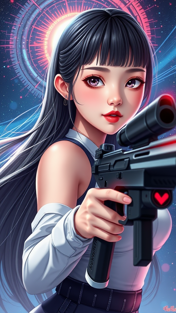 Break, 1girl, solo, gazing at the viewer, flat bangs, 3D face, stunning girl, enchanting features, k-pop idol aura, supermodel essence, captivating delicate symmetry, ideal form, medium breasts, sleek waist, slender legs, luminous eyes, goddess presence, natural skin texture with a radiant sheen, fair complexion, intricately beautiful face, vivid skin detail, charming gentle features, finely crafted visage reflecting the golden ratio, expressive and striking eyes, immaculate visage, unblemished skin, glossy hair, porcelain skin, perfect bodily proportions, flawless anatomy, realistic texture, sumptuous lips with a glossy finish, understated makeup, vibrant pupils, elegant silhouette, complex eyes, well-defined pupils, long eyelashes enhancing the gaze, slight blush, adept hands, exquisite face, alluring female form, detailed skin texture, a soft glow, Break, long flowing hair, poised with a futuristic firearm, ready for battle, adventurous spirit, beneath a star-studded sky, colorful light dispersion, wormhole universe, futuristic cityscapes, cyberpunk elements, mechanical intricacies with a metallic sheen, neon glow, windswept aura, Rembrandt lighting techniques, cosmic distortion, atmospheric fog, rendered in pixel art.