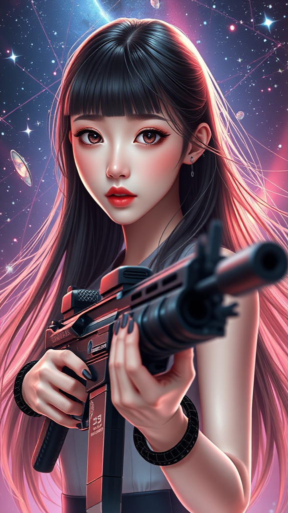 BREAK, 1girl, solo, gazing at viewer, flat bangs, 3d face, stunning girl, beautiful face, charming, kpop idol aura, supermodel elegance, strikingly symmetrical features, perfect physique, medium bust, slender waist, sleek legs, radiant eyes, goddess-like presence, natural skin texture, luminous skin, fair complexion, exquisitely detailed face, delicate and cute features, intricate detailing, harmonious facial proportions, expressive gaze, pristine complexion, ethereal hair, porcelain skin, impeccably proportioned body, flawless anatomy, realistic skin texture, inviting lips, glossy sheen, subtle natural makeup, captivating bright pupils, graceful figure, complex eyes, vivid pupils, long eyelashes, gentle blush, elegant hands, captivating female form, intricately detailed skin, glistening shiny skin, BREAK, science fiction flair, extraordinarily long hair, holding firearm, combat-ready, adventurous expression, starry expanse, vibrant light refractions, wormhole setting, futuristic skyline, cyberpunk vibes, mechanical elements, highly metallic textures, neon illuminations, wind-swept, dramatic Rembrandt lighting, cosmic distortion, misty ambiance, pixelated artistry.