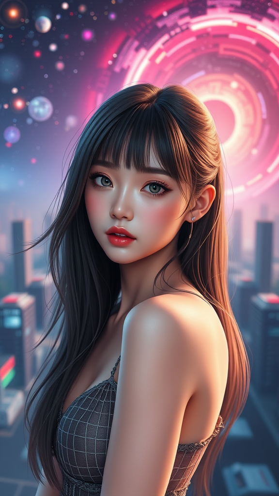 Break, 1girl, solo, gazing at viewer, sleek bangs, 3D visage, captivating girl, enchanting face, kpop star, supermodel allure, stunning symmetrical features, perfect physique, medium bust, slender waist, graceful legs, luminous eyes, ethereal presence, natural skin glow, radiant complexion, porcelain skin, exquisitely detailed face, detailed features, real skin texture, delicate charm, golden ratio harmony, expressive eyes, flawless complexion, flawless features, glossy hair, fair skin, ideal body proportions, perfect anatomy, realistic skin texture, supple lips, shiny lips, subtle makeup, vibrant pupils, svelte form, complex eyes, intricate pupils, finely detailed eyes, elongated lashes, rosy cheeks, elegant hands, impeccable hands, lovely face, beautiful form, meticulously detailed skin, glowing skin, break, science fiction essence, flowing hair, intense look, cosmic sky, vibrant refractions, wormhole universe, futuristic metropolis, cyberpunk theme, metallic texture, neon luminescence, breezy atmosphere, Rembrandt-inspired light, cosmic warp, atmospheric mist, pixel art influence, gripping a weapon, poised for battle, adventurous spirit.
