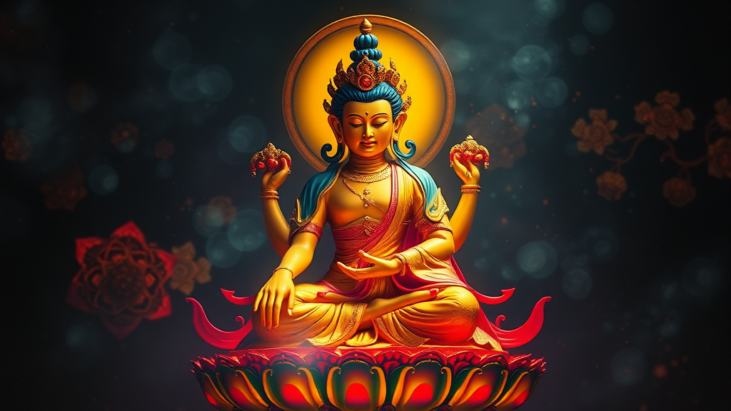 Breathtaking action shot of a full-body Buddhist Avalokitesvara sitting majestically, enveloped in stunning and exquisite colors, against a mysterious dark background. The dazzling and colorful composition is inspired by Katsuhiro Otomo and Rumiko Takahashi, with the intricate detail of a thangka illustration. The scene is rendered in 8k using Accent Octane Rendering, enhanced with cinematic color grading reminiscent of a 35mm lens at f/1.8 aperture. The overall effect is a striking blend of beauty and spirituality, captivating and radiant.