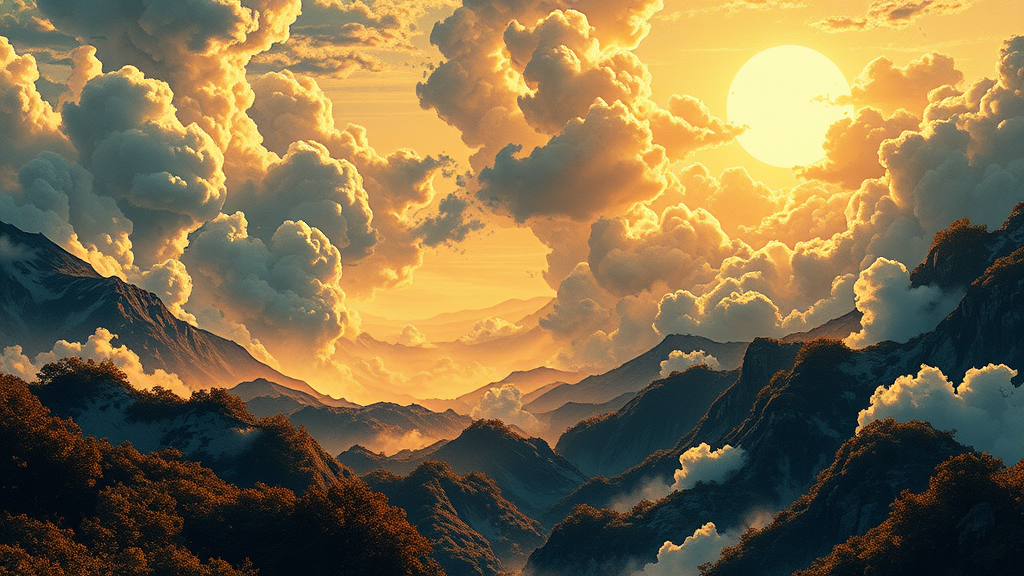 Breathtaking panoramic vista of a majestic Japanese landscape, crafted in a Kingdom Hearts-inspired ink style, featuring bold contrasts and epic, swirling cloud formations, illuminated by dramatic, soft golden sunlight; rendered in stunning high resolution with an emphasis on intricate detail and atmosphere, capturing the serene yet mysterious essence of a fantastical Eastern realm.