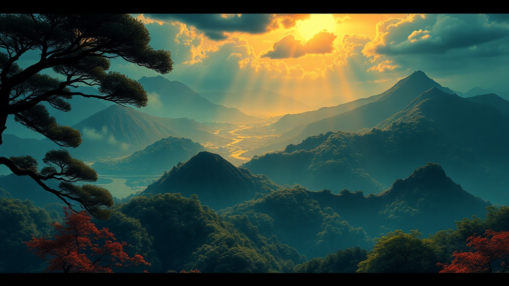 Breathtaking vista of a majestic Japanese landscape, reimagined in a Kingdom Hearts-inspired ink style, featuring moody and dynamic lighting, captured in stunning 8k resolution with a cinematic atmosphere and expansive 3:2 aspect ratio.