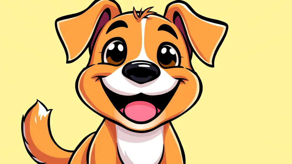 Bright and colorful vector illustration featuring an adorable dog with big, expressive eyes and a wide, friendly smile, looking directly at the viewer. The cartoon-style artwork emphasizes the dog's playful and joyful nature, with exaggerated features like a wagging tail and floppy ears. The background is cheerful and vibrant, adding to the overall happy and whimsical atmosphere.