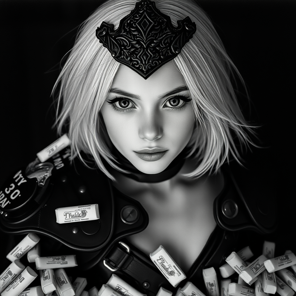 Bright design, intricate black armor, detailed and stunning face, beautiful young girl with medium-length white hair, slender with a toned midriff, surrounded by pain relievers, overlapping elements, award-winning composition, deep photography, Ilford HP5 film style, black and white with crushed blacks, depth of field, moody with film grain, strong shadows, natural lighting. Negative aspects: low resolution, text, errors, poor quality, jpeg artifacts, duplicates, out of frame issues, disproportionate features, and deformations are to be avoided.