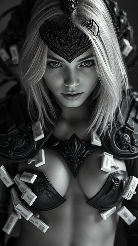 Bright design, Rule of Thirds, intricate black armor, detailed stunning face, beautiful young woman, medium-length silver hair, slender, toned midriff, surrounded by pain relievers, overlapping compositions, award-winning, deep photography, Ilford HP5 film, black and white, rich blacks, depth of field, dark photo, film grain, shadows, natural light, Negative prompt: lowres, text, error, cropped, worst quality, low quality, jpeg artifacts, unattractive, duplicate, morbid, mutilated, out of frame, incorrect anatomy, disproportional, extra limbs, distorted face, disfigured, malformed limbs, missing limbs, extra limbs, fused digits, excessive digits, elongated neck, watermark, signature.