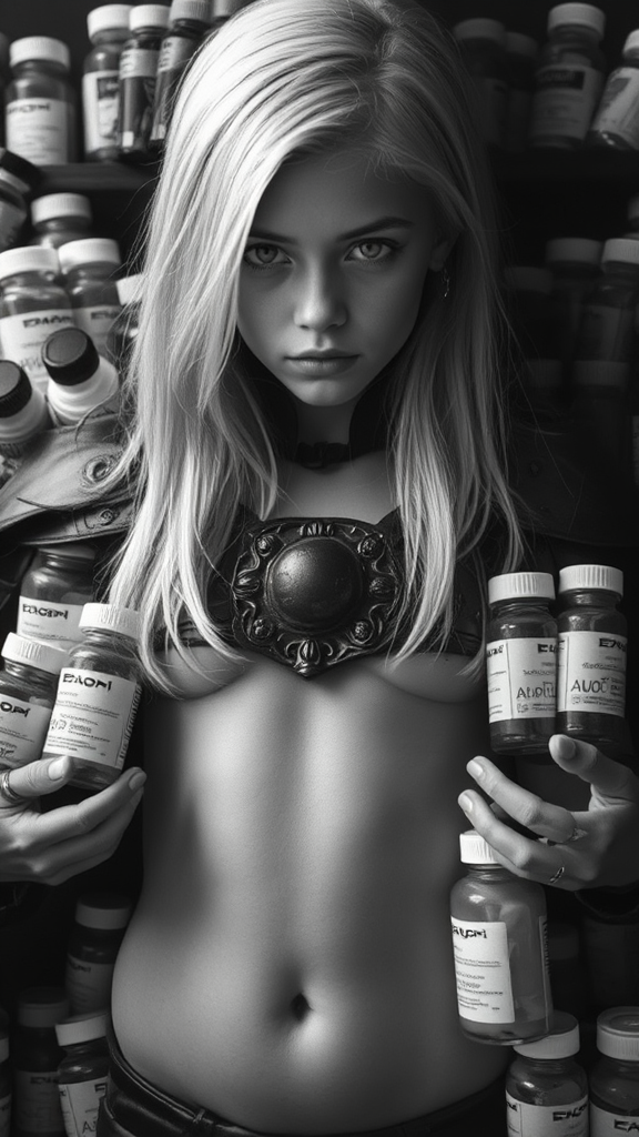 Bright design, Rule of Thirds, Pixabay, intricate black armor, stunning detailed face, beautiful young girl, medium length white hair, slender, toned stomach, revealing midriff, surrounded by an array of medicine bottles, overlapping compositions, award-winning, deep photography, Ilford HP5 film, black and white, crushed blacks, depth of field, dark photo, film grain, shadows, ambient natural light, Negative prompt: low resolution, errors, cropped, poor quality, jpeg artifacts, unattractive, duplicate elements, distorted, out of focus, extra fingers, distorted hands, poorly rendered face, mutations, anatomy issues, disproportionate, extra limbs, duplicate features, unappealing proportions, malformed limbs, missing features, fused fingers, elongated neck, watermarks, signatures, exaggerated features.