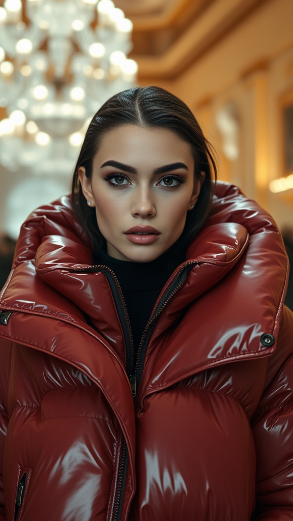 Bright fashion shoot portrait of an incredibly stunning woman in an oversized puffer jacket designed by Craig Green, Dingyun Zhang, Yeezy, Balenciaga, and Vetements, captured in sharp focus with exceptional clarity and detail. The setting is cinematic and lavish, exuding a high-fashion editorial feel reminiscent of Vogue magazine shoots. The glossy finish enhances the glamorous and symmetrical presentation, elevating the overall essence of avant-garde style.