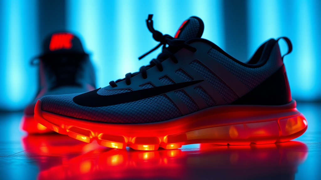 Brightly illuminated athletic shoes crafted from rubber and advanced composite fibers, featuring a sleek black Nike swoosh prominently on the shoe. Captured in a style reminiscent of Steven Meisel, with exquisite and nuanced lighting. The scene is crafted using cutting-edge rendering technology, offering high definition clarity and an exceptionally high image quality -- aspect ratio 2:3 -- rendered with subtle creative enhancements to maintain the core essence and visual allure.
