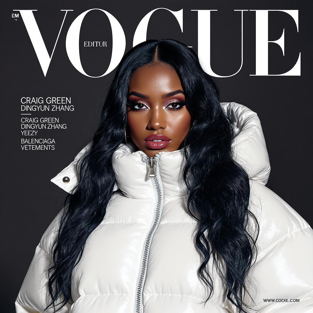 Brightly illuminated editorial portrait of an exceptionally stunning woman dressed in an oversized puffer jacket designed by Craig Green, Dingyun Zhang, Yeezy, Balenciaga, or Vetements. The shot is in sharp focus with intricate details, capturing a cinematic and stylish atmosphere. The aesthetic is high-gloss, glamorously symmetrical, and befitting a high-fashion magazine spread. Off-White elements and a sense of luxury pervade the image, creating a captivating visual narrative.