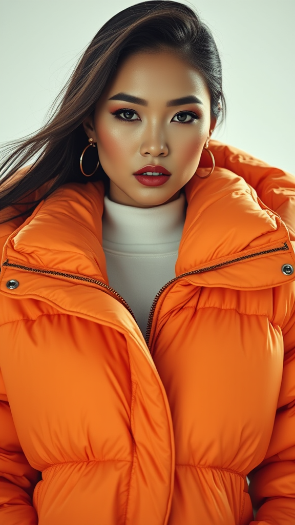 Brightly illuminated fashion portrait of a stunning woman dressed in an exaggeratedly oversized puffer jacket from designers like Craig Green, Dingyun Zhang, Yeezy, Balenciaga, and Vetements, featuring sharp focus and vivid detail. The composition is cinematic and meticulous, with elements of Off-White style, exuding glamour and symmetry reminiscent of a high-fashion Vogue editorial. The image captures the essence of a glossy magazine photoshoot, balancing elegance and avant-garde fashion.