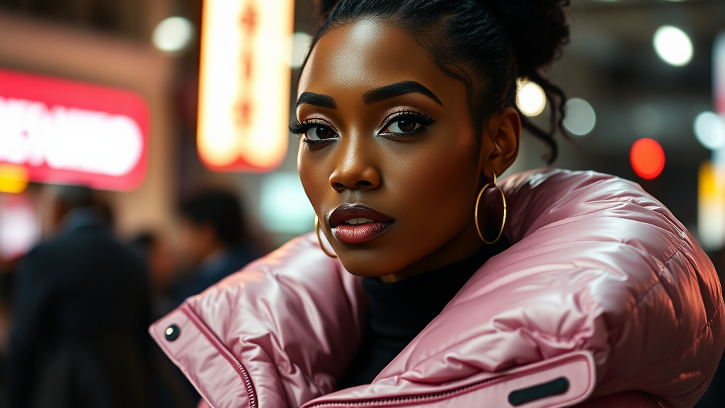 Brightly illuminated fashion portrait of an exceptionally stunning woman donning an oversized puffer jacket designed by Craig Green, Dingyun Zhang, Yeezy, Balenciaga, and Vetements, in sharp focus with clear, intricate details. The scene is cinematic and polished, exuding a touch of glamour, with balanced composition reminiscent of a Vogue editorial or fashion magazine shoot, exhibiting a glossy and high-fashion aesthetic.
