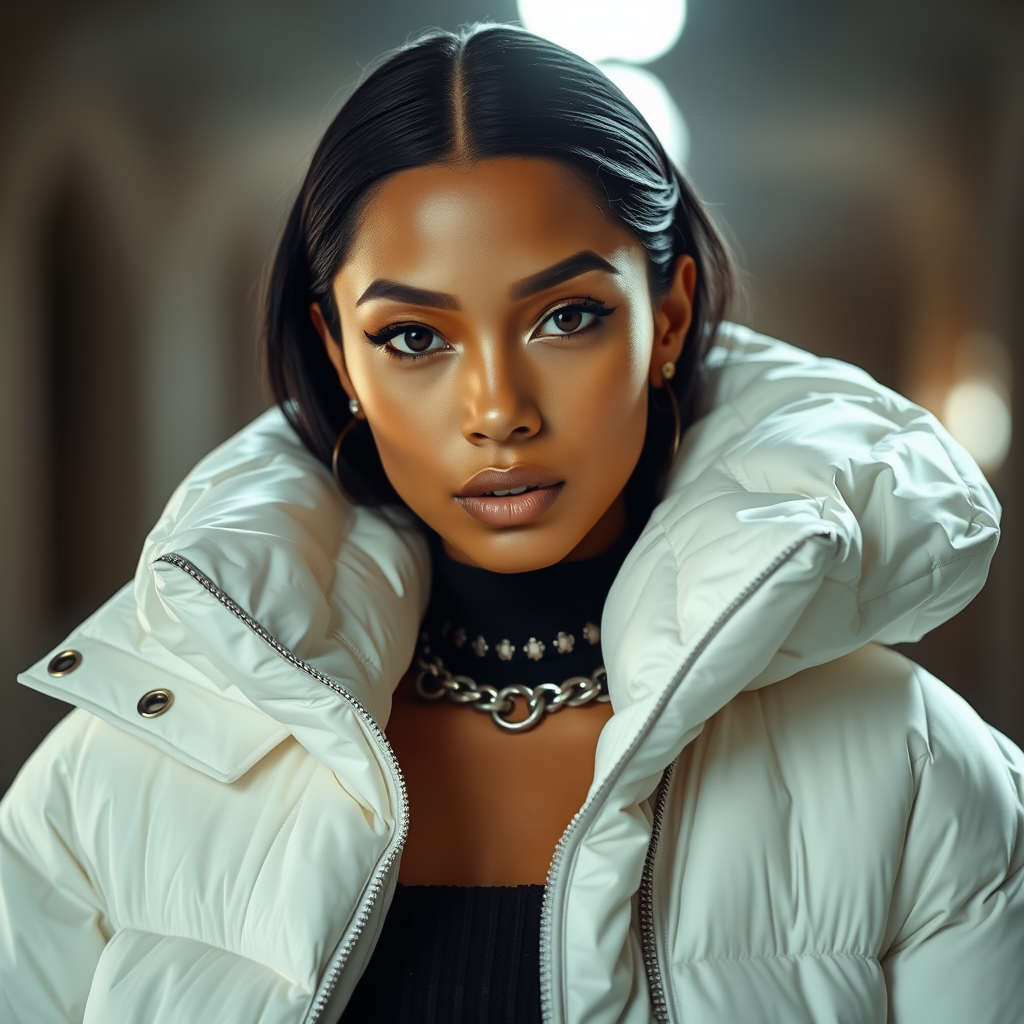 Brightly illuminated fashion portrait of an exceptionally stunning woman donned in an immensely oversized puffer jacket by renowned designers such as Craig Green, Dingyun Zhang, Yeezy, Balenciaga, and Vetements. The shot is in sharp focus with clarity and intricate detailing, exuding a cinematic and refined aura. The fashion piece, in tones of Off-White, evokes a glamorous and symmetrical Vogue editorial style, reminiscent of a glossy, high-fashion magazine shoot. The overall composition captures the essence of modern luxury and avant-garde fashion.