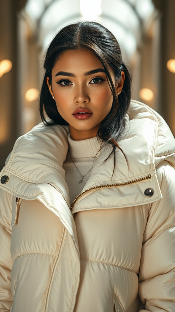 Brightly illuminated fashion portrait of an exceptionally stunning woman adorned in a heavily oversized puffer jacket designed by renowned labels such as Craig Green, Dingyun Zhang, Yeezy, Balenciaga, and Vetements. The image is in sharp focus, exhibiting a clear and intricate level of detail, with a cinematic and glossy finish. The scene exudes glamour with a symmetrical composition, akin to a high-fashion editorial in Vogue. This magazine-ready photograph elegantly showcases the luxurious and avant-garde aesthetics of off-white tones.