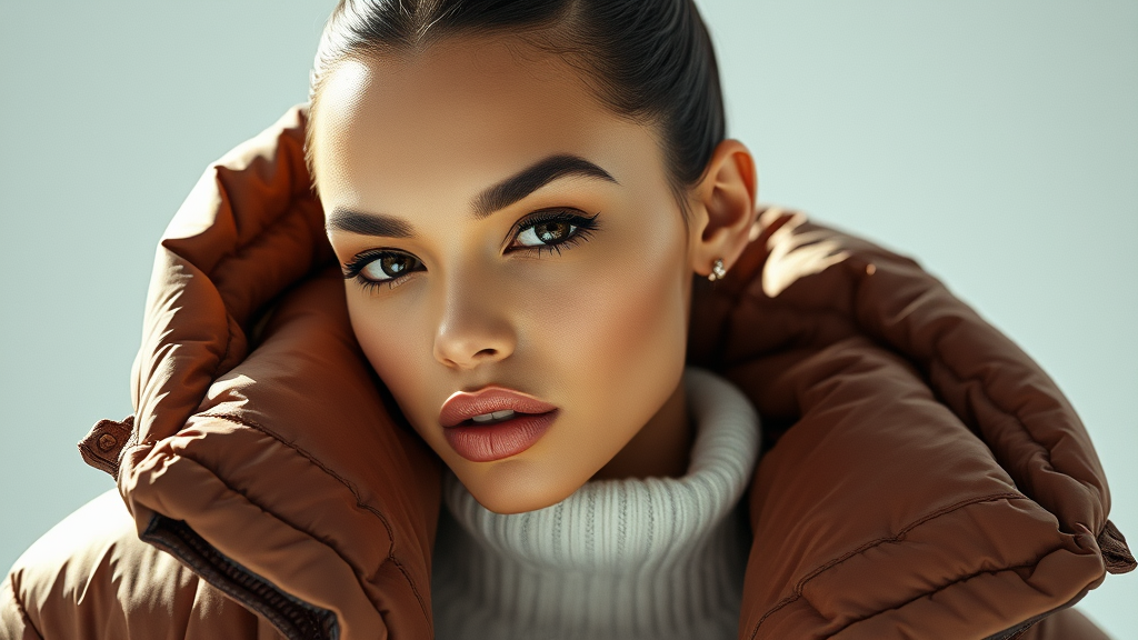 Brightly illuminated fashion portrait of an extraordinarily beautiful woman in a dramatically oversized puffer jacket by renowned designers like Craig Green, Dingyun Zhang, Yeezy, Balenciaga, and Vetements; impeccable focus, sharp clarity, cinematic and intricate details, with a touch of off-white elegance. The composition exudes glamour, symmetry, and sophistication, reminiscent of a high-end Vogue editorial spread; a glossy and high-fashion magazine shoot.