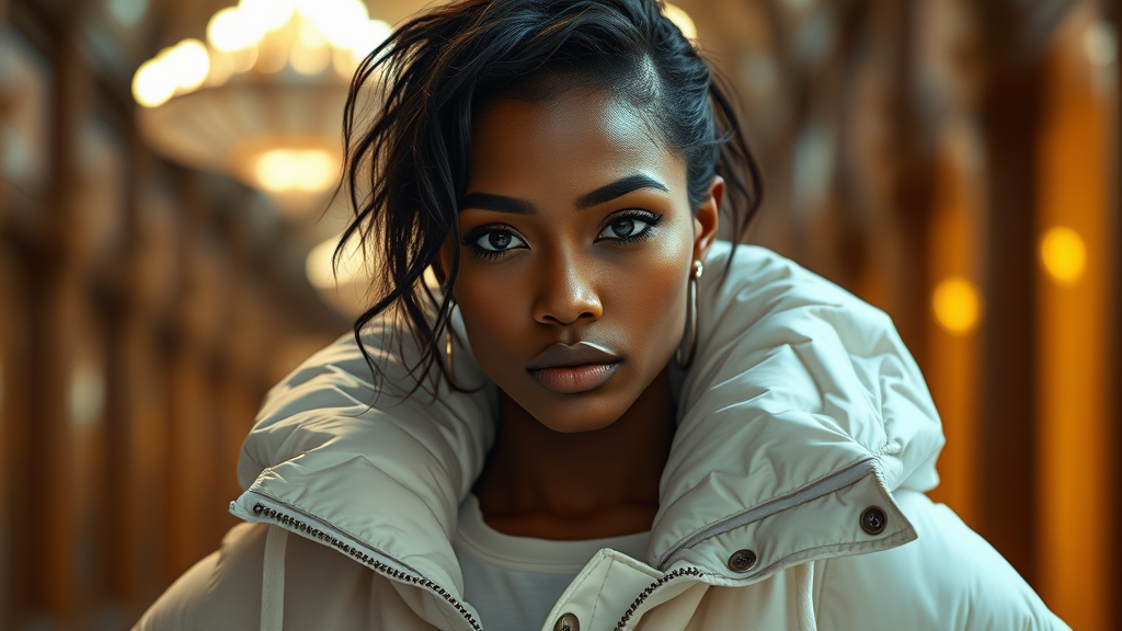 Brightly illuminated fashion portrait of an extraordinarily stunning woman clad in an oversized puffer jacket designed by the likes of Craig Green, Dingyun Zhang, Yeezy, Balenciaga, and Vetements. The image is captured with sharp focus, showcasing intricate details, and exudes a cinematic aura. Featuring an Off-White finish, the portrait embodies a glamorous, symmetrical aesthetic reminiscent of a Vogue editorial, perfect for a glossy fashion magazine spread.