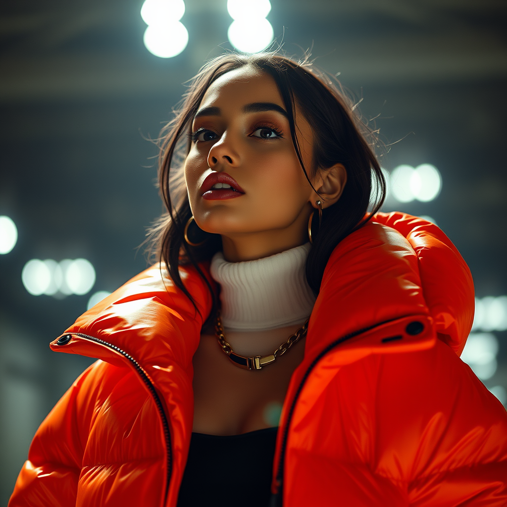 Brightly illuminated fashion portrait showcasing an exquisitely stunning woman in an oversized puffer jacket by renowned designers Craig Green, Dingyun Zhang, Yeezy, Balenciaga, and Vetements. The focus is sharp and detailed, capturing a cinematic and glamorous essence. The scene embodies a symmetrical and editorial vibe reminiscent of a Vogue magazine shoot, with a glossy and high-fashion aesthetic that incorporates elements of Off-White chic.