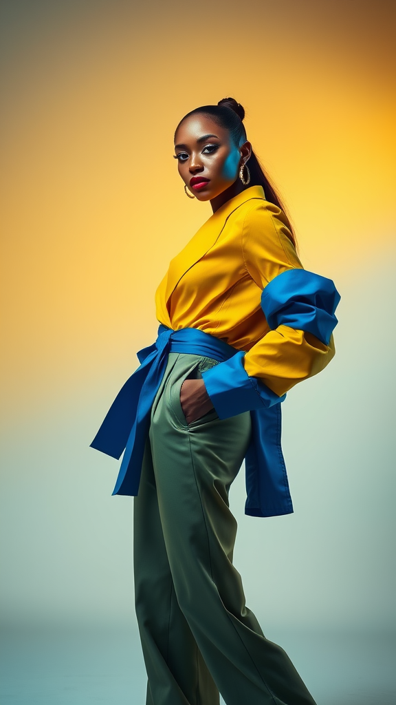Brightly illuminated full-body fashion portrait of an exceptionally striking woman in a dynamic stance, showcasing a sophisticated blend of yellow and blue attire inspired by Craig Green, Dingyun Zhang, and Yeezy. The scene captivates with elements from Balenciaga and Off-White, achieving a crisp, sharply focused, and highly detailed cinematic quality. The image exudes a glamorous and symmetrical essence, echoing a Vogue editorial fashion shoot perfect for a high-fashion magazine spread.