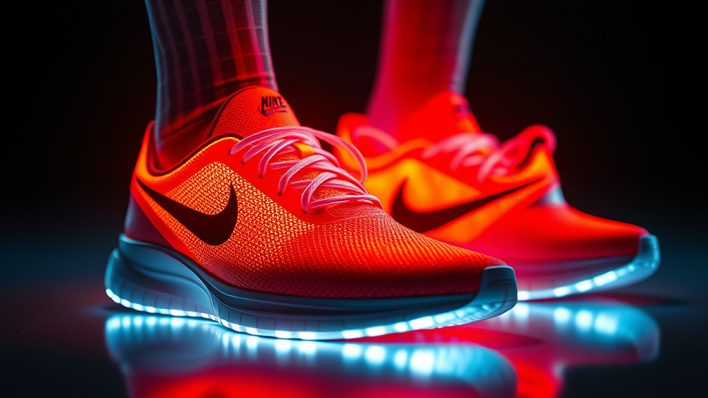 Brightly illuminated Nike velocity sneakers crafted from advanced rubber and composite fibers, featuring a sleek black Nike emblem, captured in a photographic style reminiscent of Steven Meisel, utilizing exquisite lighting with subtle nuances, rendered in Unreal Engine and Octane Render, high definition quality, image clarity 180, aspect ratio 2:3, with a focus on capturing dynamic textures and intricate details while maintaining the core aesthetic vision.