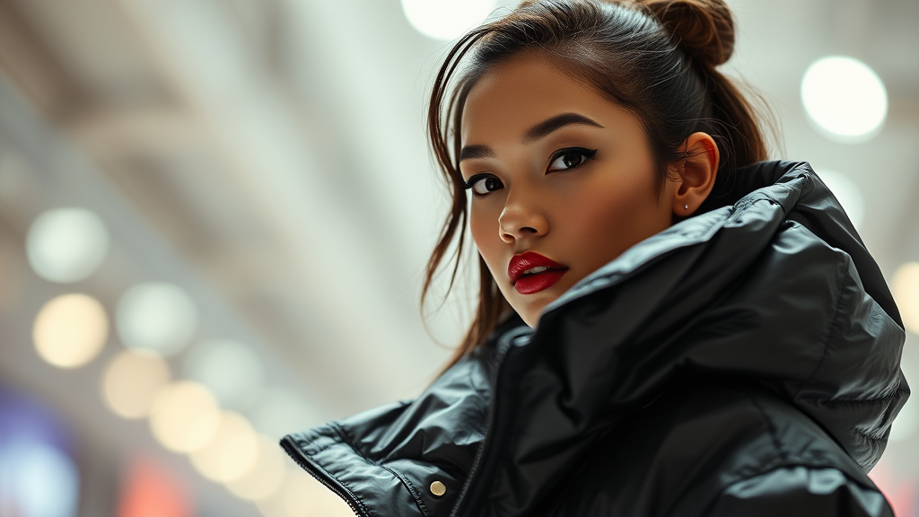 Brightly lit fashion editorial featuring an exceptionally stunning woman adorned in an oversized puffer jacket designed by renowned brands like Craig Green, Dingyun Zhang, Yeezy, Balenciaga, and Vetements. The image captures sharp focus and clarity, emphasizing intricate details with a cinematic flair. It exudes glamour and symmetry commonly associated with high-fashion Vogue shoots, presenting a glossy magazine aesthetic. The ensemble exudes both avant-garde and offbeat elegance, making a bold statement in contemporary fashion photography.