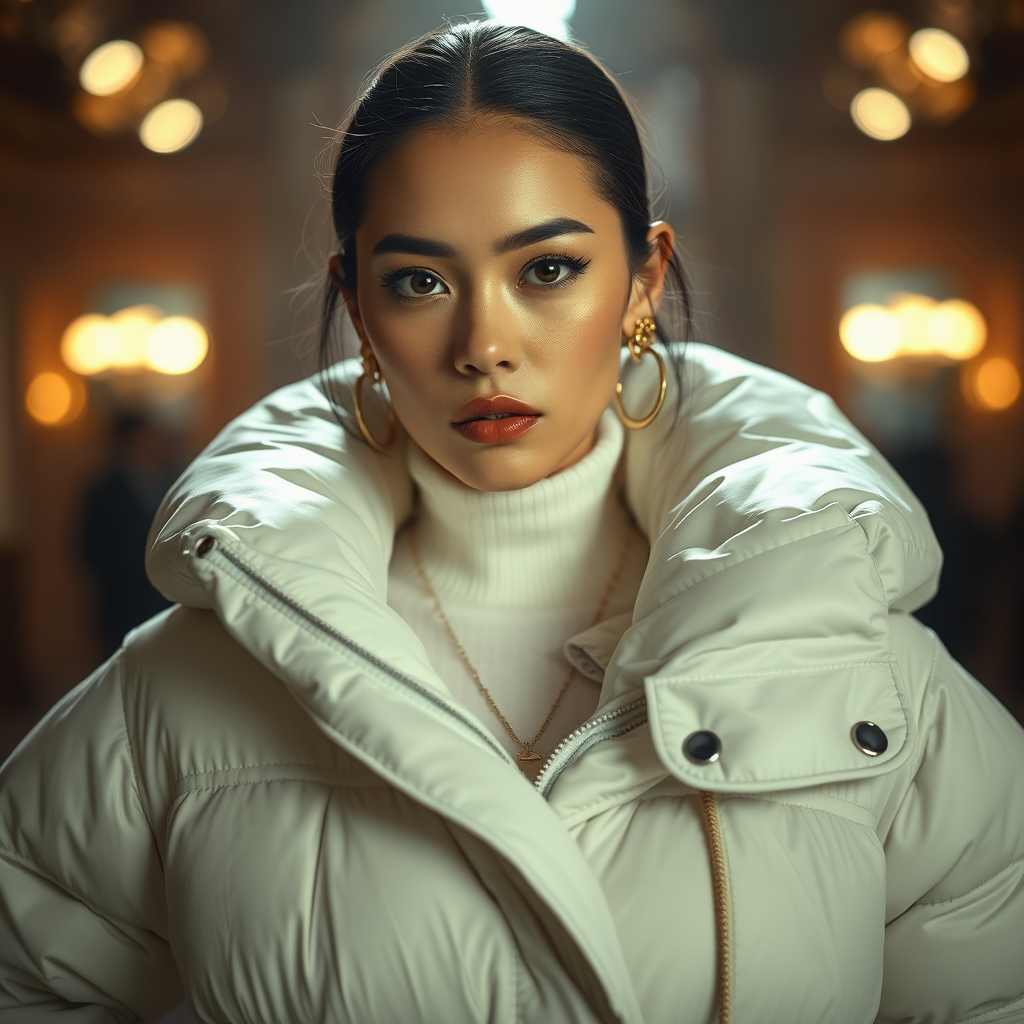 Brightly lit fashion portrait of an exceptionally beautiful woman in an oversized puffer jacket designed by Craig Green, Dingyun Zhang, Yeezy, Balenciaga, and Vetements, featuring sharp focus and high detail, cinematic feel, luxurious and contemporary style, with elements of Off-White's distinctive flair, exuding glamour and chic elegance, visually symmetrical, suited for a Vogue editorial, embodying the essence of high fashion magazine photography with a glossy and polished finish.