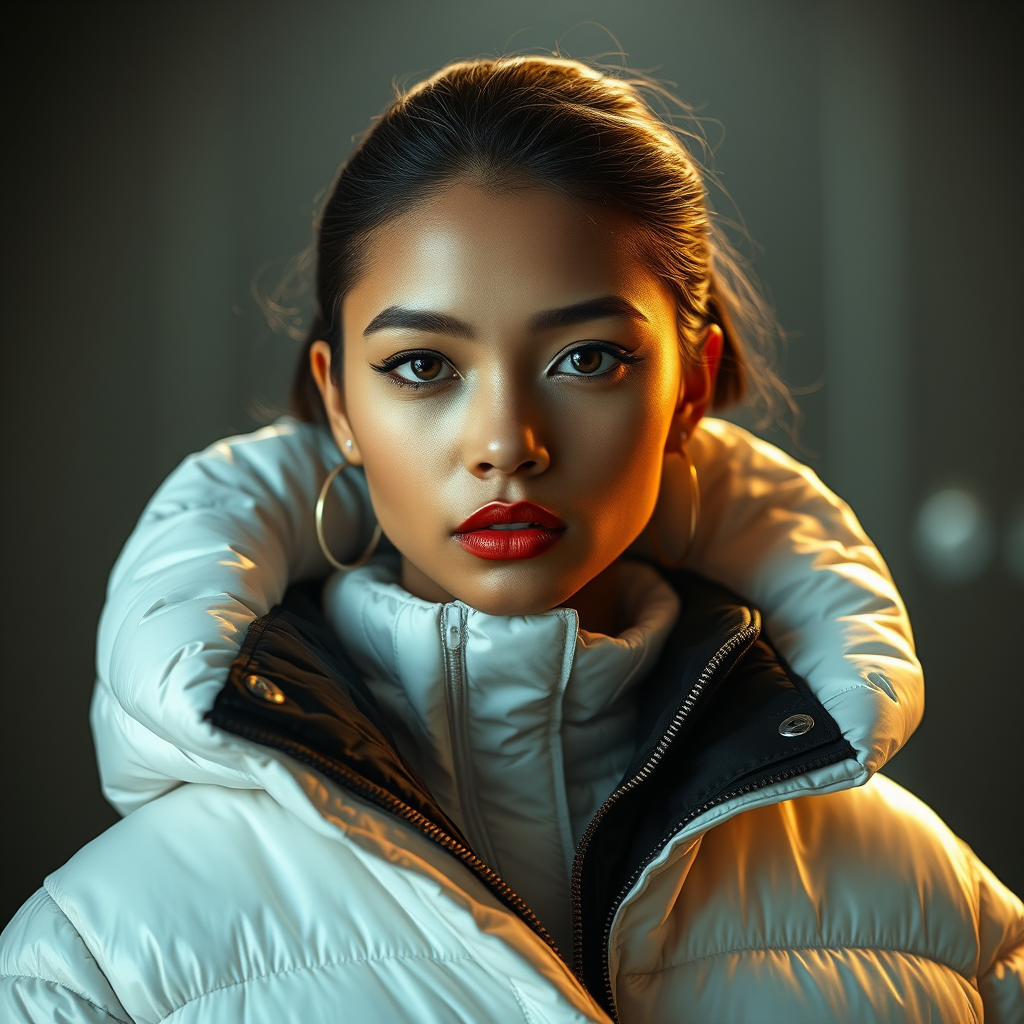 Brightly lit fashion portrait of an exceptionally stunning woman adorned in an oversized puffer jacket designed by Craig Green, Dingyun Zhang, and inspired by Yeezy, Balenciaga, and Vetements. The image is in sharp focus with a clear, cinematic quality, exuding a high level of detail. The scene conveys glamour and symmetry, evoking the style of a Vogue editorial spread. The jacket design brings in elements of Off-White. A lustrous, glossy finish enhances the magazine photoshoot vibe, highlighting the cutting-edge fashion aesthetics.
