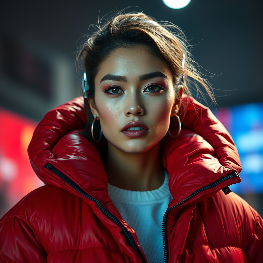 Brightly lit fashion portrait of an incredibly stunning woman clad in an oversized puffer jacket from designers like Craig Green, Dingyun Zhang, Yeezy, Balenciaga, and Vetements. The focus is sharp with clarity and detail, giving a cinematic feel. The image radiates glamour and elegance, akin to an Off-White style, with symmetry and a Vogue editorial vibe. This magazine-like shoot presents a glossy, high-fashion essence.
