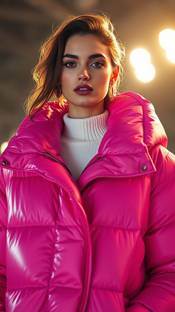 Brightly lit fashion shoot featuring an exceptionally attractive woman clad in an extremely oversized puffer jacket by designers such as Craig Green, Dingyun Zhang, Yeezy, Balenciaga, and Vetements. The image is sharp, clear, and intricately detailed, exuding a cinematic quality. The composition is glamorous and symmetrical, embodying the essence of high-fashion editorial spreads typical of Vogue. The shot is magazine-ready, glossy, and elegant, incorporating subtle creative twists that enhance the core concept while maintaining its essence.