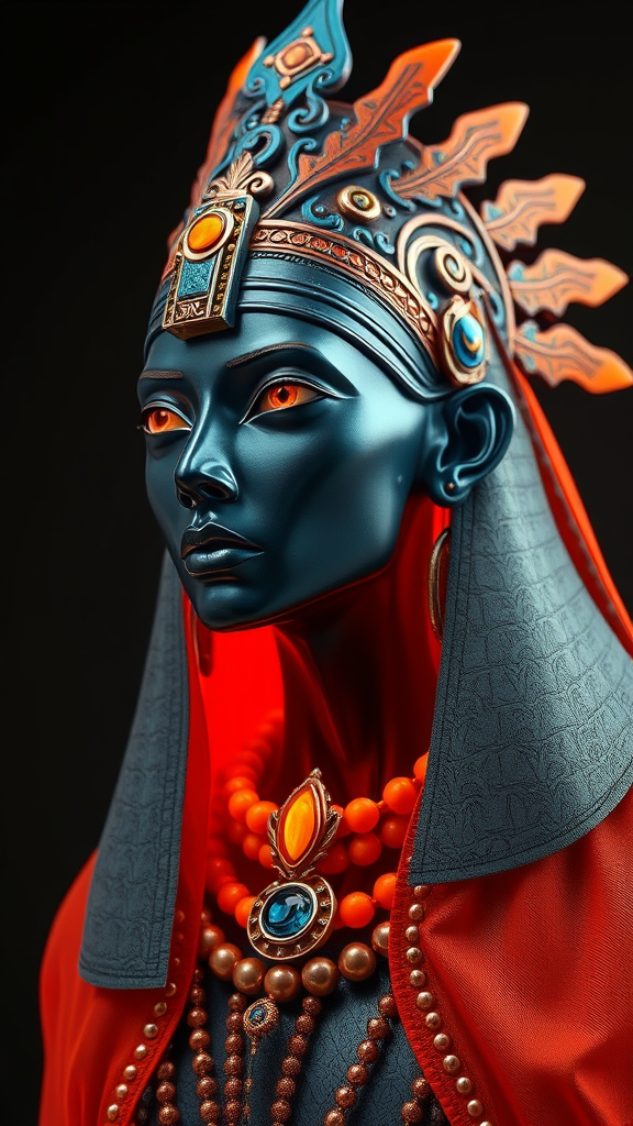 Brooklyn-based artist Niksa Amira crafts hyper-realistic 3D models inspired by techno shamanism, blending dark orange and azure hues with Egyptian iconography. This fantasy-inspired work weaves elements of oriental design and afrofuturism with a rich palette of dark azure and crimson, merging ancient motifs with futuristic visions in a striking 2:3 aspect ratio.