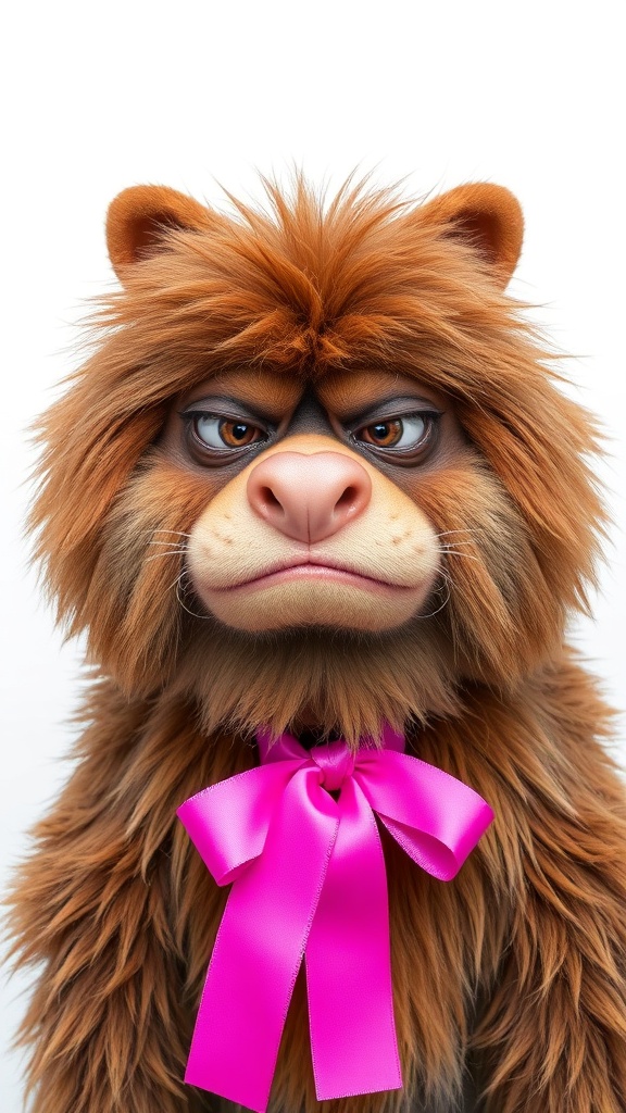 View this AI-generated image featuring a fluffy brown creature with an exaggerated expression of disgust adorned with a vibrant pink ribbon set against a plain white backdrop. Created using advanced AI technology, this image showcases vibrant colors. Perfect for creative projects, digital art, inspi