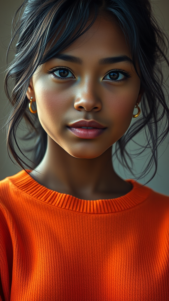 Brown skin tone south Asian woman inspired by Velma from Scooby Doo, wearing an orange sweater, sharp focus digital art portrait, single subject concept art with post-processed dynamic lighting, in the style of ultra-detailed work by Emylie Boivin, slightly tousled hair and confident expression.