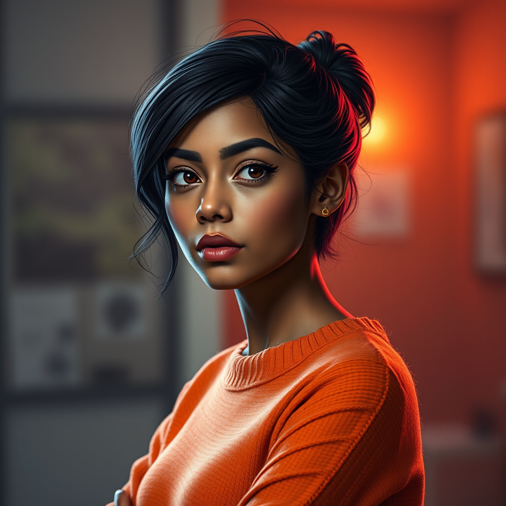 Brown skin tone, South Asian woman inspired by Velma from Scooby Doo, wearing an orange sweater, captured in a portrait style; digital art in sharp focus. The scene highlights a single subject in concept art style, enriched with post-processed, dynamic lighting reminiscent of Emylie Boivin's ultra-detailed approach. Her expressive eyes and thoughtful expression give a modern twist to the classic character, set against a softly blurred background that accentuates her intriguing presence.