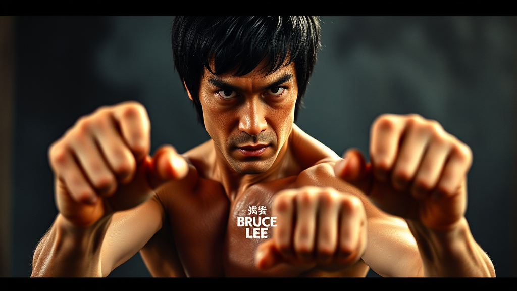 Bruce Lee in fists of fury, hands poised with intensity, embodying raw power and focus, set against a dramatic backdrop that highlights his dynamic energy and martial prowess --ar 2:3 --v 4