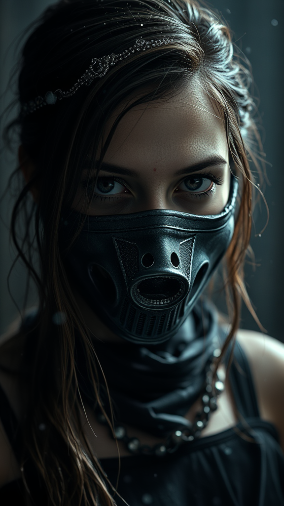 Brunette girl portrait wearing a mysterious mask, capturing a morbid and dark atmosphere with wet elements, rendered in a highly detailed and photorealistic style. The setting is dense with a dramatic and epic ambiance, reminiscent of trail cam footage. The scene is empty yet creepy, with hyperornate details that echo the photographic style of Haris Nukem, combining a touch of eerie elegance with striking realism.