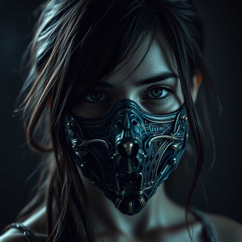 Brunette girl portrait, wearing an intricate mask, morbide, dark atmosphere, highly detailed, rendered in octane, glistening wet look, dense and atmospheric environment, epic and dramatic mood, unsettling yet mesmerizing, reminiscent of trail cam footage, photorealistic with hyperornate details, in the style of a Haris Nukem photograph, with subtle artistic modifications.
