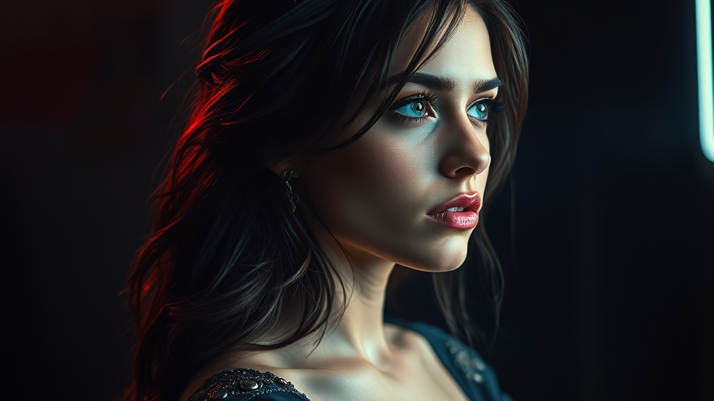 Brunette princess, centered, looking to the right, key visual, intricate, highly detailed, dark studio setting with rim lighting, dual-tone lighting creating a dramatic effect, dimly lit, showcasing low key breathtaking beauty, precise line art with vibrant colors, comprehensive cinematic style reminiscent of Carne Griffiths and Conrad Roset, captivating features, elegantly crafted, high resolution, sharp focus, and maintaining a sense of charm and mystique.