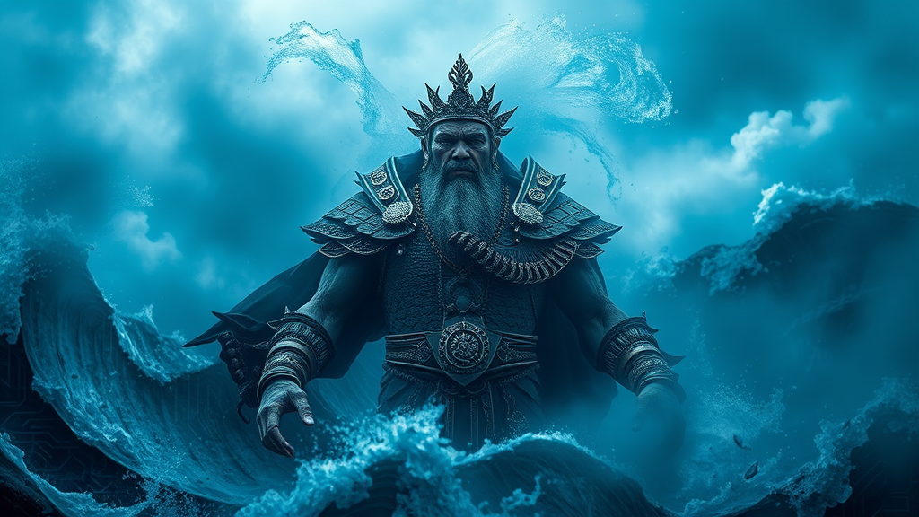 Brutal man sovereign of the ocean amidst swirling waves, enveloped in blue mist and fog, exuding glory; his face perfect, lifelike, with a full body stance on a terrain interlaced with circuit patterns. His attire is an intricate ensemble, embodying fantasy, reminiscent of hyper-maximalist dark tribal cinematic visions. Rendered in ultra-detailed 8k resolution with Octane 3D, capturing a photorealistic essence. The composition is sharp and perfect, with intense shadows and dramatic lighting, suitable for high-definition HDR wallpaper, steeped in high-quality details.