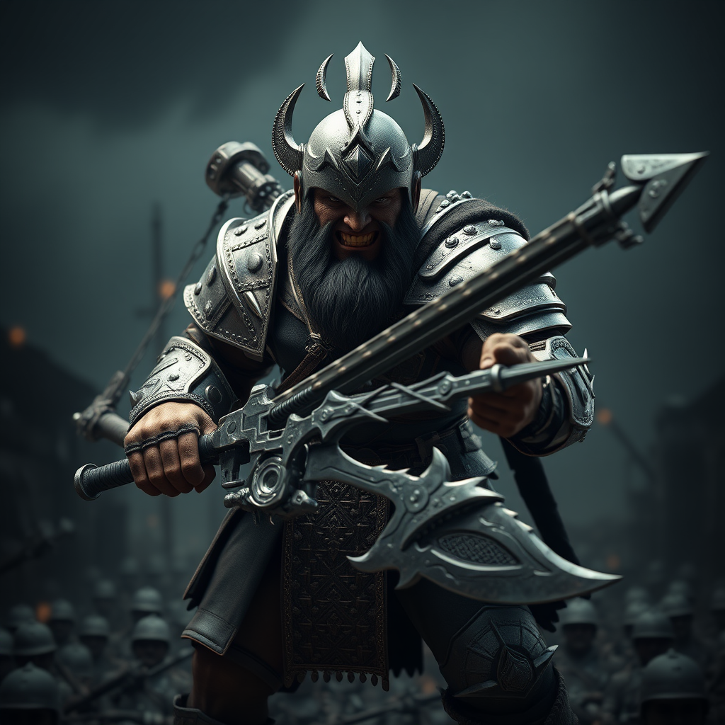 Brutal warrior with a menacing grin, wearing detailed armor and wielding a complex weapon; the scene set against a dark-toned battlefield backdrop. The warrior strikes a commanding militant pose, exuding an intense presence. The image composition is epic with dramatic shadows, capturing the grandeur. Designed for trend artstation use, the visual is crafted as a wallpaper with 3D render using Octane. Enhanced VFX and cinematic lighting highlight the isometric view, produced with Blender in 8K resolution, achieving a cinematic feel while excluding a close-up portrait, maintaining a wide scope for enriched storytelling.