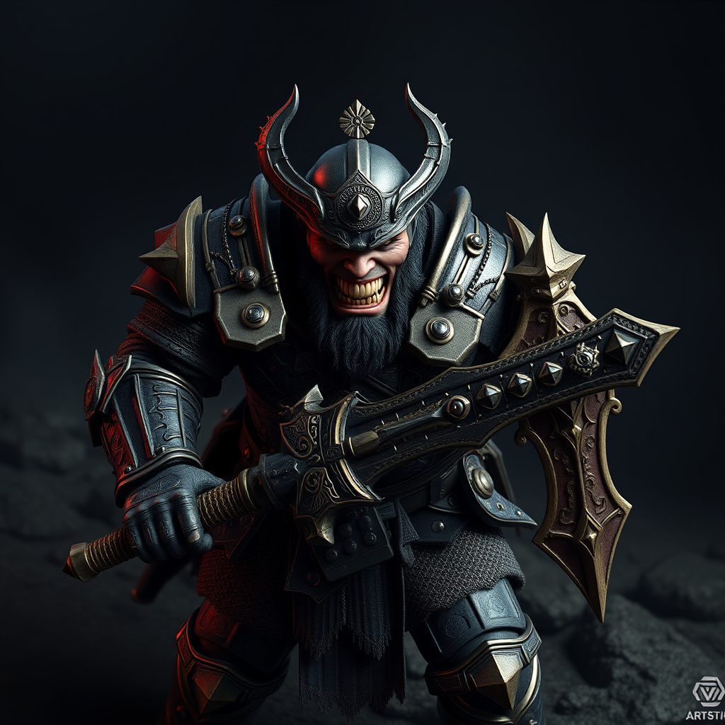 Brutal warrior with a sinister grin, clad in ornate armor and wielding a detailed weapon, set against a dark-toned battlefield. The figure strikes a militant pose, capturing an emotional and epic composition with dramatic shadows. Inspired by trending ArtStation styles, the scene is rendered in 3D with Cinematic lighting using Blender, showcasing an isometric perspective in 8K quality. Avoids close-up portraits, emphasizes a wide view for a grand wallpaper effect, enhanced with VFX elements for a cinematic experience.